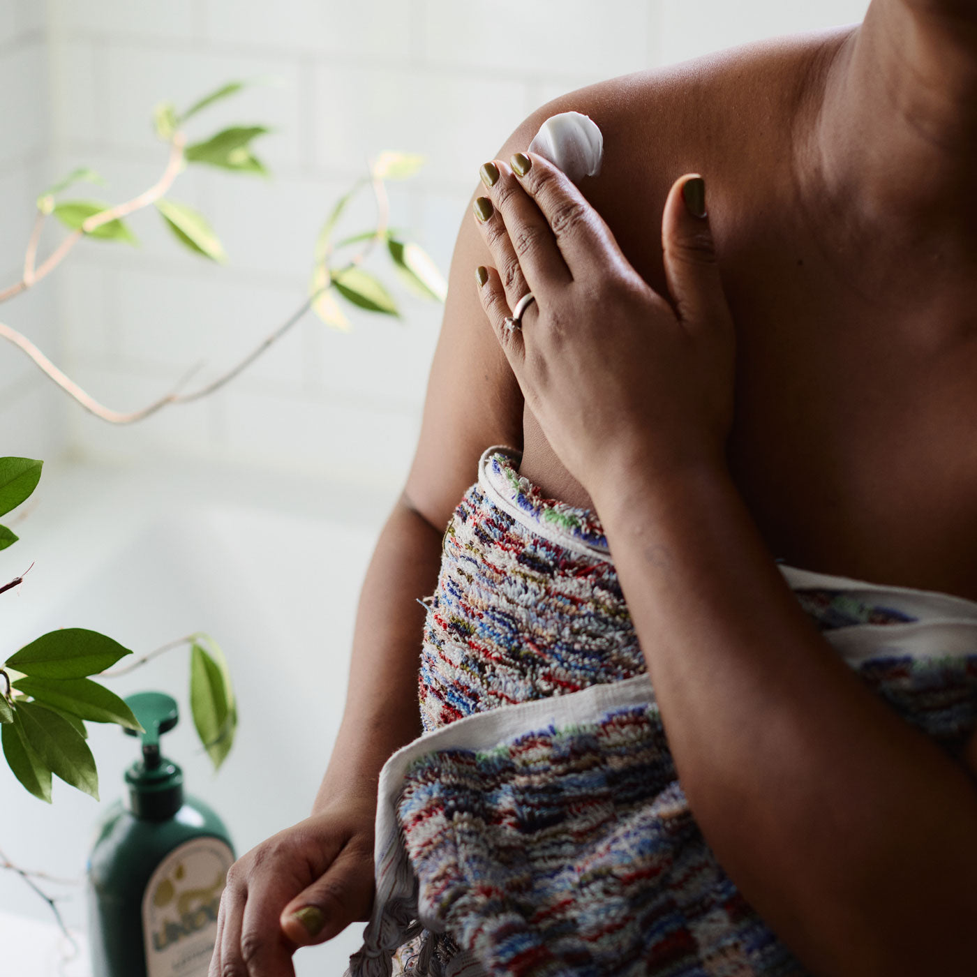During lotion time, family members sit together and gently apply lotion to one another, starting with the eldest. As each person applies lotion, they say a calming word they wish for the other like “peace,” “health,” or “joy” while making slow, mindful strokes.